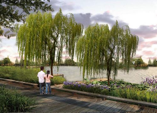 依托現狀地形地貌,打造親水平臺,結合用地規(guī)劃打造條狀小游園。